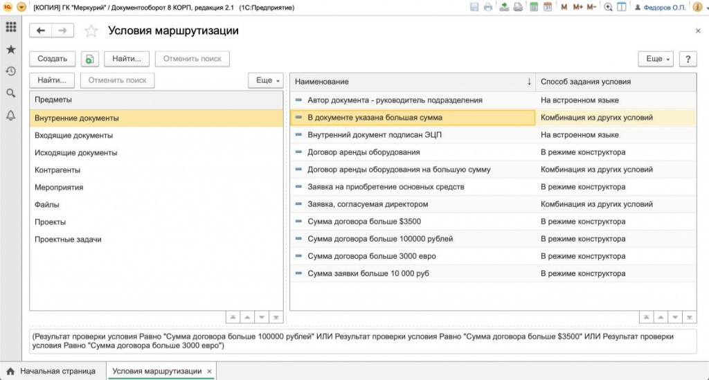 Как видно из примера, регистрация документа выполнится в том случае, если будет согласован документ с большой суммой, а также подписан договор аренды на большую сумму.