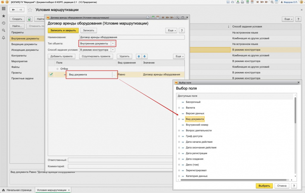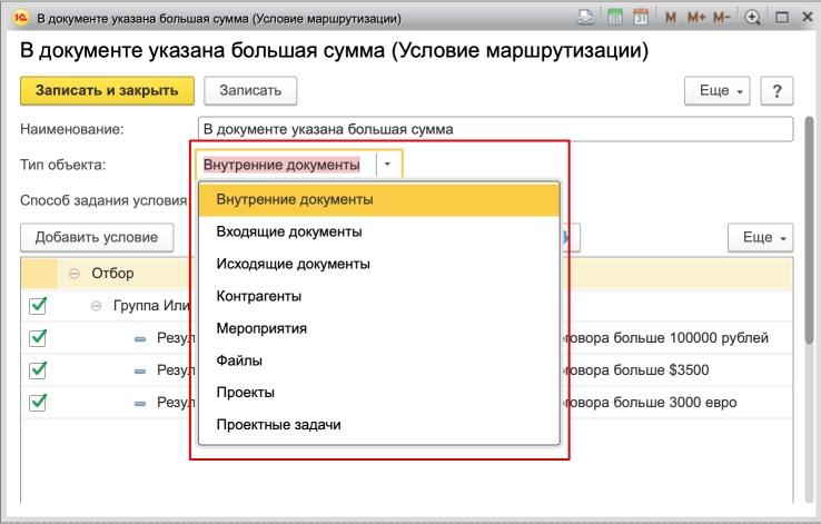Объектами в этом случае могут выступать: документы (входящие, внутренние, исходящие), файлы, проекты, мероприятия, проектные задачи, различные контрагенты. После выбора объекта определяем один из трех способов задания условий:
