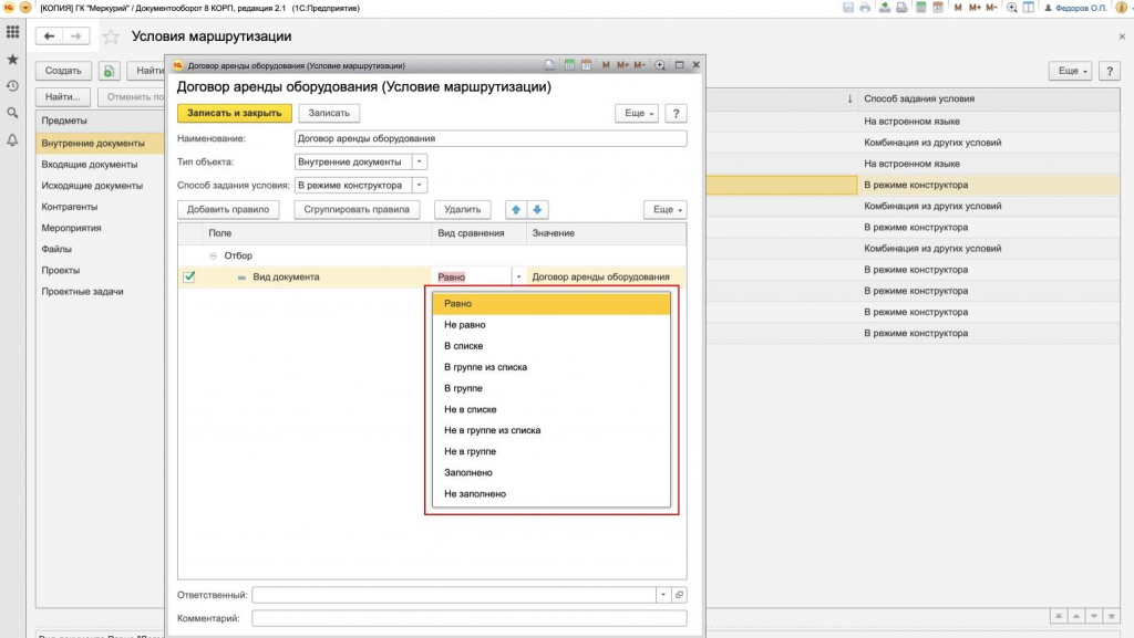 После того, как реквизит выбран, необходимо определиться с будущим содержанием с помощью вариантов сравнения. Вариант сравнения имеет прямую зависимость от типа выбранного реквизита и может быть: Заполнено, Не заполнено, Равно, Не равно, В списке, Не в списке. В последнем случае будет сравниваться введенный список значений со значениями выбранного реквизита.