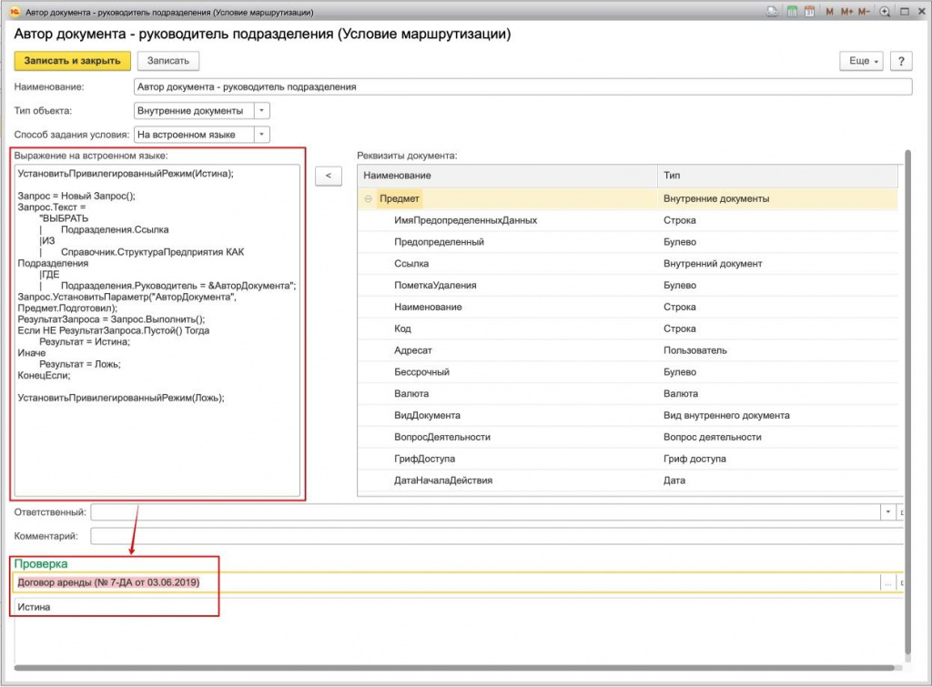 В правой части окна располагаются реквизиты выбранного документа, используемого в выражениях встроенного языка. Проверить работоспособность вновь созданного условия можно, не выходя из конструктора в том же самом окне. Конечно же, для того, чтобы написать корректное условие, нужно обладать определенными знания и опытом работы с языком 1С, поэтому лучше, если в создании условий будет принимать участие программист 1С.