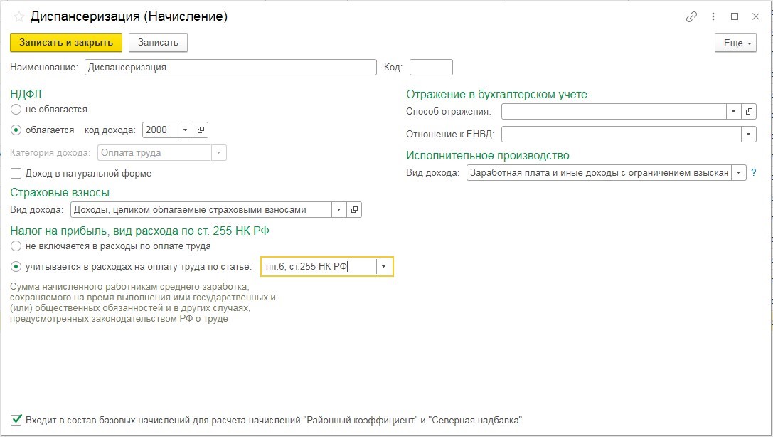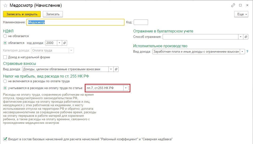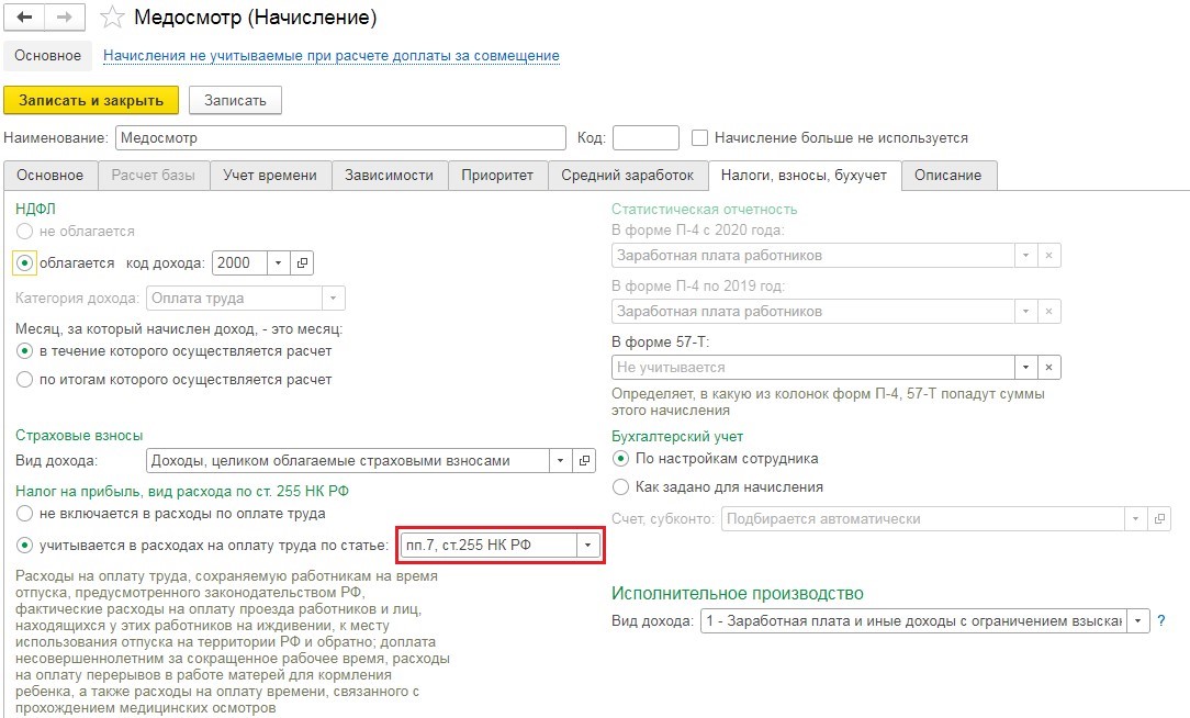Начисление оплаты дней по медосмотру производится аналогичным образом, как и по диспансеризации. Отличие заключается только в создании начисления. В документе нужно поставить, что такой расчет учитывается в расходах по налогу на прибыль как затраты на оплату труда по пп. 7 ст. 255 НК РФ.
