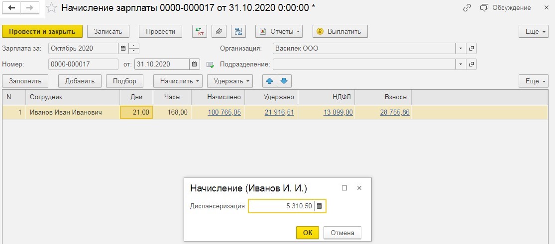 Эту сумму нужно начислить через раздел "Зарплата и кадры", выбрав пункт "Все начисления". В новом окне создается документ "Начисление зарплаты", затем производится расчет зарплаты за месяц. После этого у работника, отправленного на диспансеризацию, уменьшается количество рабочих дней именно на дни по диспансеризации. После этого по кнопке "Начислить" выбирается новое начисление.