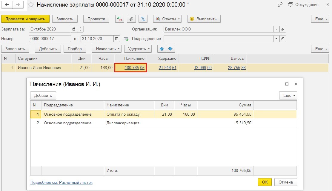 Чтобы проверить начисление, нужно нажать на сумму, которая отображается гиперссылкой в столбце "Начислено". Если документ составлен верно, его можно провести и закрыть.