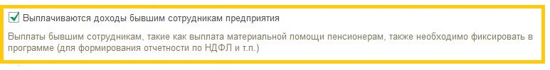Для того чтобы в программе появилась возможность начисления материальной помощи, нужно зайти в настройки расчёта заработной платы и активировать параметр выплаты доходов бывшим работникам организации: