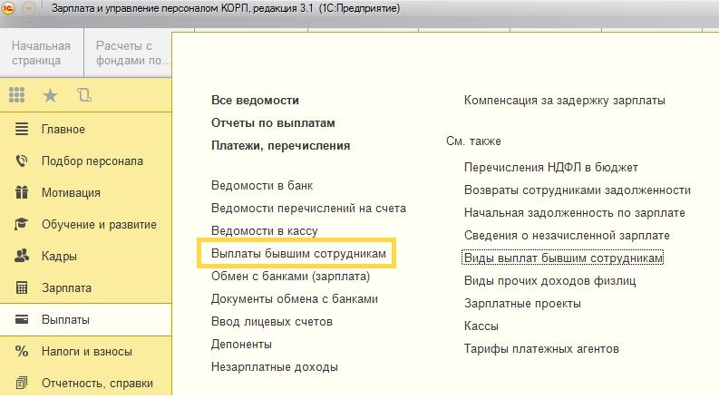 Меню «Выплаты» -> См. также -> Виды выплат бывшим сотрудникам