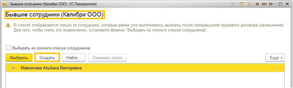 • При добавлении бывшего работника в табличную часть, появится форма с ограниченным выбором работников, в которой будут отображаться только те сотрудники, которым уже начислялись выплаты, или те, кто раньше работал на предприятии. В том случае, если сотрудник ушёл из организации до того момента, как начался вестись учёт в программе, то его необходимо просто включить в этот список через окно подбора: