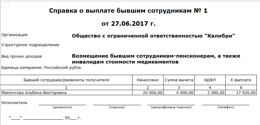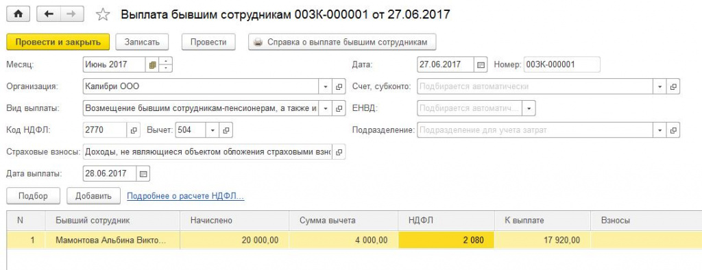 Далее материальную помощь необходимо зарегистрировать. Для этого нужно воспользоваться документом «Выплата бывшим сотрудникам», который специально предназначен для того, чтобы зафиксировать сумму подоходного налога и (или) страховых взносов, а потом отразить их в отчётности.