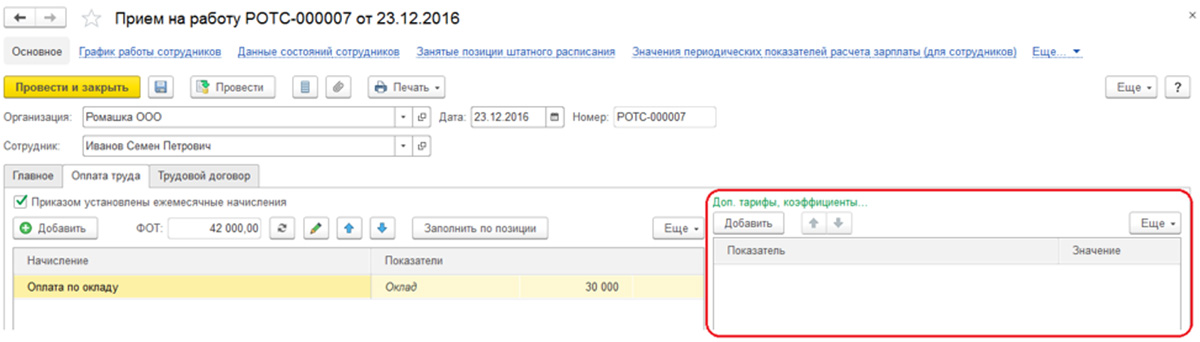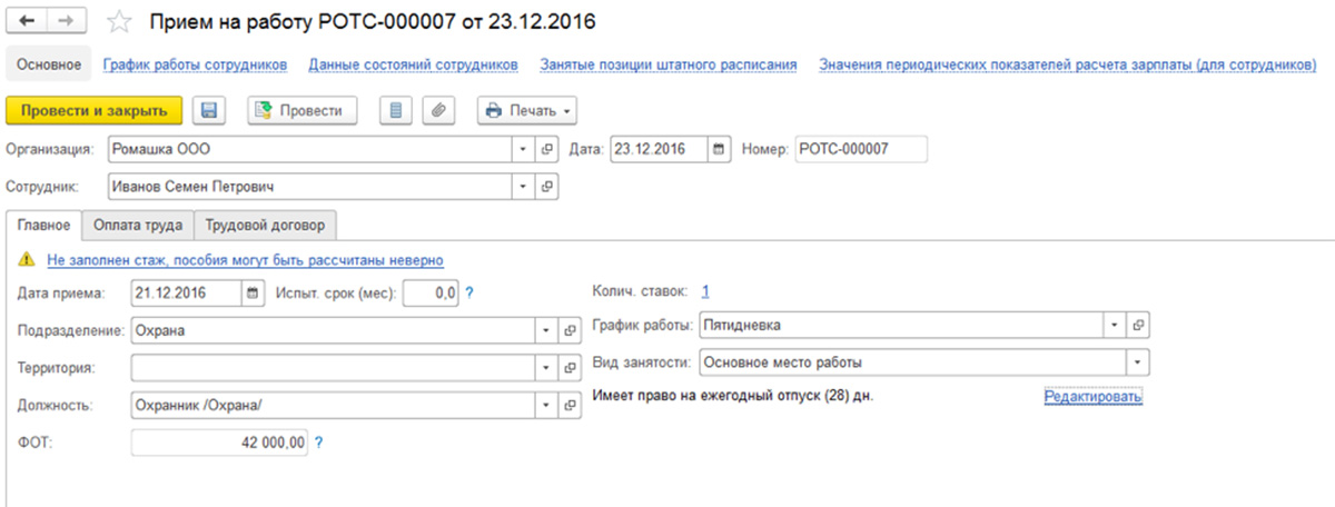 В разделе «Главное» требуется указать дату приема на работу, количество ставок, а также должность, график, подразделение и территорию, если учета в разрезе территорий уже настроен в учетной политике предприятия.