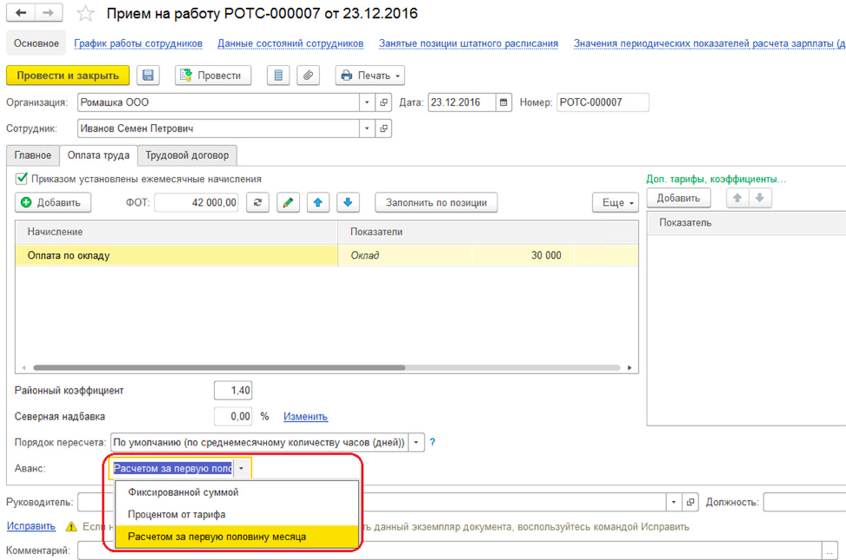 Во вкладке «Оплата труда» необходимо выбрать плановые начисления сотруднику, установить порядок расчета авансовых платежей, а также пересчета тарифа в показатели «СтоимостьДня», «СтоимостьДняЧаса», «СтоимостьЧаса» при расчете праздничных, сверхурочных и т.п.