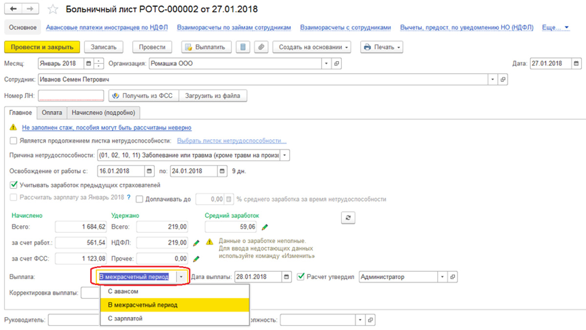 - в межрасчетный период. Если выбран такой способ, система дает возможность создать отдельный документ на выплату на основании раздела «Больничный лист»;