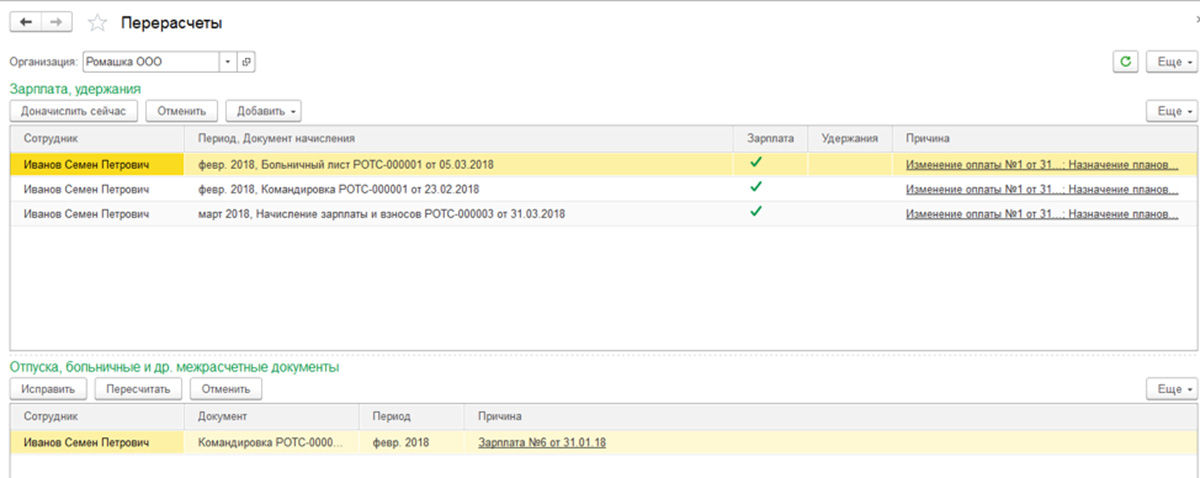 При установке опции «Выполнять доначисление и перерасчет зарплаты отдельным документом» такие перерасчеты будут зафиксированы в графе «Доначисление, перерасчеты».