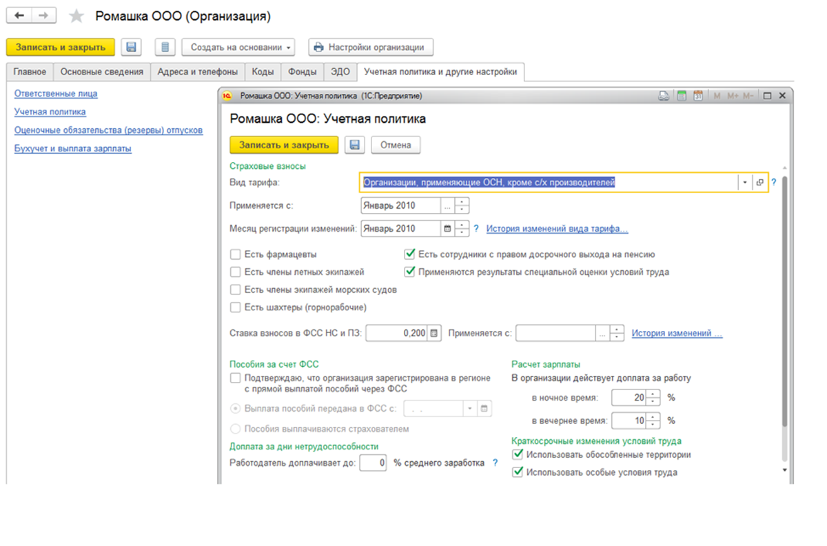Здесь можно ввести первичные сведения о предприятии, заполнить поля, связанные с учетной политикой, кадровым учетом, а также расчетом зарплаты. Помощник сразу же создаст начисления и удержания в соответствии с полученными настройками.
