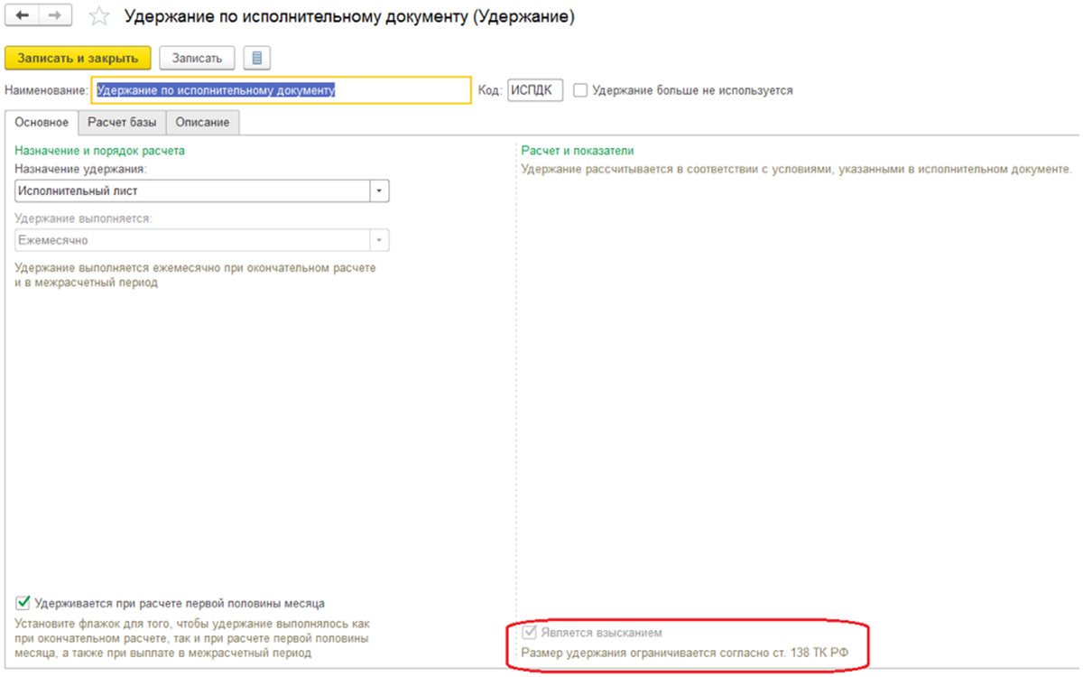 - Ограничение суммы удержаний по проценту от заработной платы. Такая настройка дает возможность ограничить общий размер удержаний этого типа по ст. 138 ТК РФ. Если указан этот признак, то в удержаниях появится доступ к опции «Является взысканием»*.