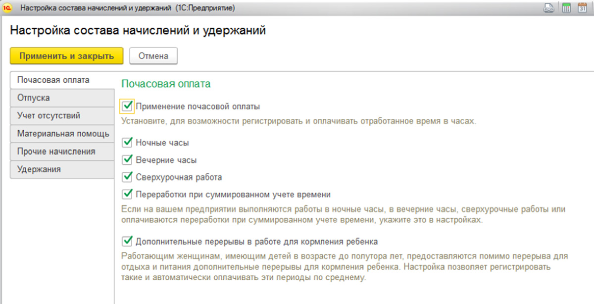 - Работа полную смену в пределах нормы. Этот вид расчета фиксирует отработанное время. Настройки устанавливают для основного планового начисления за целый день.