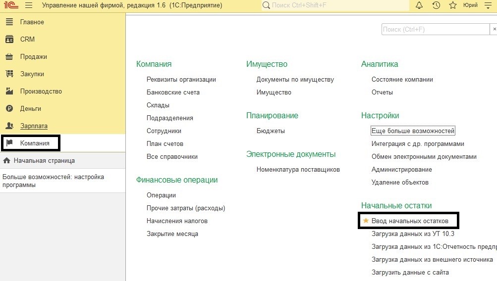 Нужно завести все начальные остатки, так они оказывают влияние на все разделы учета. Если этого не сделать, то управленческий баланс не сойдется. Для этого в программе «1С: Управление нашей фирмой» есть специальный документ «Ввод начальных остатков». Его можно найти в разделе «Компания». Настройку можно вести через помощника. Позже, когда будет необходимо, вы можете вернуться и поменять вводные и сделать правки. (Рис 10)