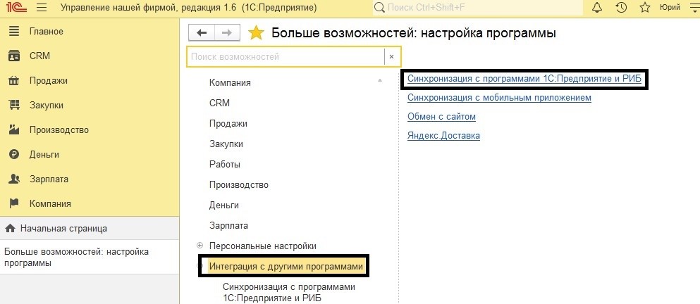Далее переходите во вкладку в 1С:УНФ «Синхронизация с программами». (рис 12).