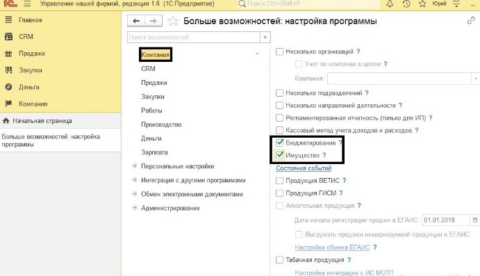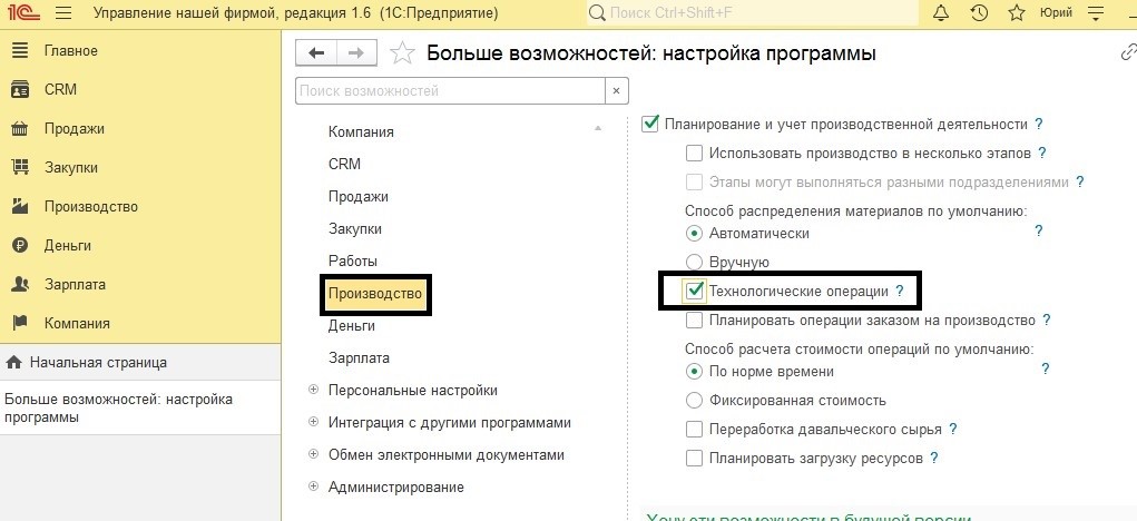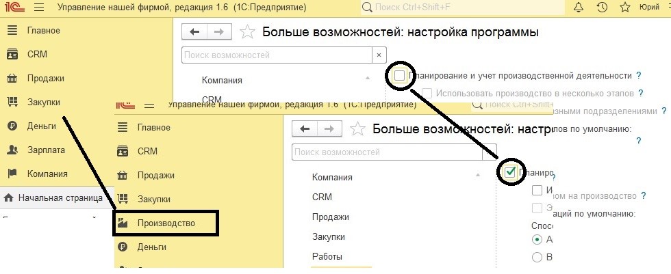 Или другой пример: когда вы включаете опцию «Планирование и учет производственной деятельности» автоматически становится активным раздел «Производство». Появляется доступ к функционалу по учету выпуска продукции, производственному планированию и контролю. (рис 9)