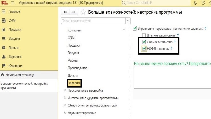 Обратите внимание, что в системе есть настройки, которые играют роль для внешнего вида и в целом видимости и отражения разделов в программе. Например, если вы не установили «флажок» в опции «Управление персоналом, начисление зарплаты», то весь раздел «Зарплата» не будет отображаться в окне. Не будет возможности вести учет данных сотрудника, его рабочего времени и различного рода начислений.