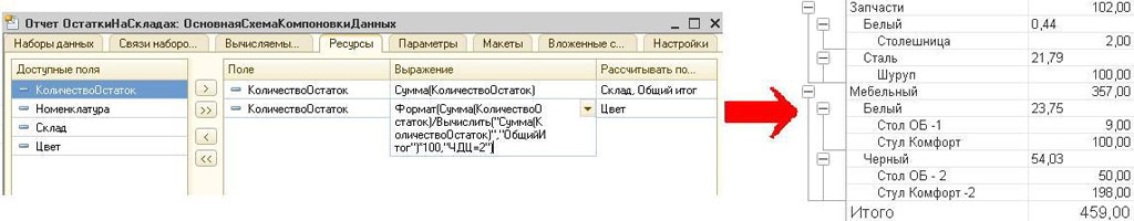 В качестве примера, мы разберем ситуаций, в которой нам нужно узнать сколько единиц товара находиться на каждом складе. Для этого, с помощью оператора "Вычислить" отразим процент единиц номенклатуры по цвету, от общего количества товаров. Теперь мы выбираем тип группировки. Необходимо выставить по складам и общая. А для цветовой дифференциации — поставим по цвету. После чего выводим результат. Дополнительно использовав оператор "Формат", для округления процентов. Конечный результат будет таковым: