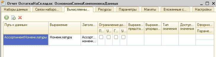 Нам потребуется номенклатура, для того что бы в итоге отразить ее ассортимент. Что бы это сделать, нам потребуется в столбец "Выражения", переписать данные с запроса "Номенклатура". После чего добавим копию столбца, но уже с другим именем. Таким образом, у нас получиться настроить другие итоги по колонкам. Добавляем нужные операции и вычисляем поле, нажимаем на вкладку "Настройка" и добавляем его в перечень записей.