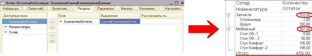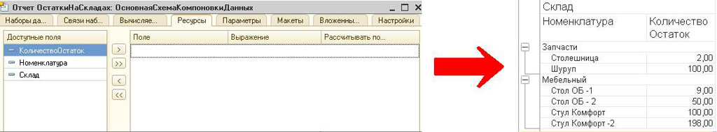 Сейчас мы рассмотрим вывод завершенного отчета на СКД. Для настройки итогов, нужно перейти на вкладку "Ресурсы", после чего вы увидите две вкладки. Слева будет поля из запроса, а с права будет таблица. Если пользователя не задержаться на этой вкладке, то программа не будет рассчитывать и выведет данные, которые она получила после запроса. Но мы попробуем сделать обычный расчет общего количества номенклатуры на всех складах. Для этого, нам потребуется переместить поле в правую часть, после чего установить в качестве выражения сумму.