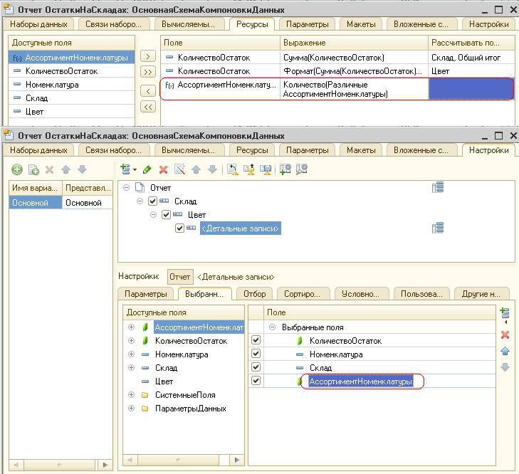 Нам потребуется номенклатура, для того что бы в итоге отразить ее ассортимент. Что бы это сделать, нам потребуется в столбец "Выражения", переписать данные с запроса "Номенклатура". После чего добавим копию столбца, но уже с другим именем. Таким образом, у нас получиться настроить другие итоги по колонкам. Добавляем нужные операции и вычисляем поле, нажимаем на вкладку "Настройка" и добавляем его в перечень записей.