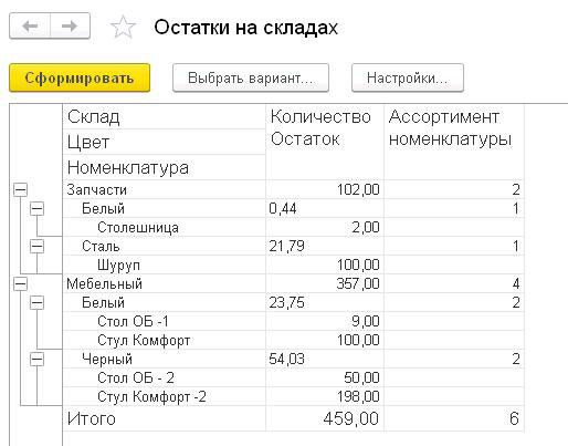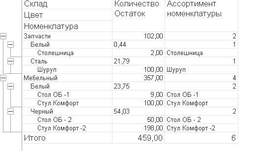 Если запустить отчет, то мы увидим, что все посчиталось верно. Но наименование номенклатуры дублировалось. Для того, что бы убрать наименование номенклатуры, нам потребуется изменить настройку вывода отчета на экран.