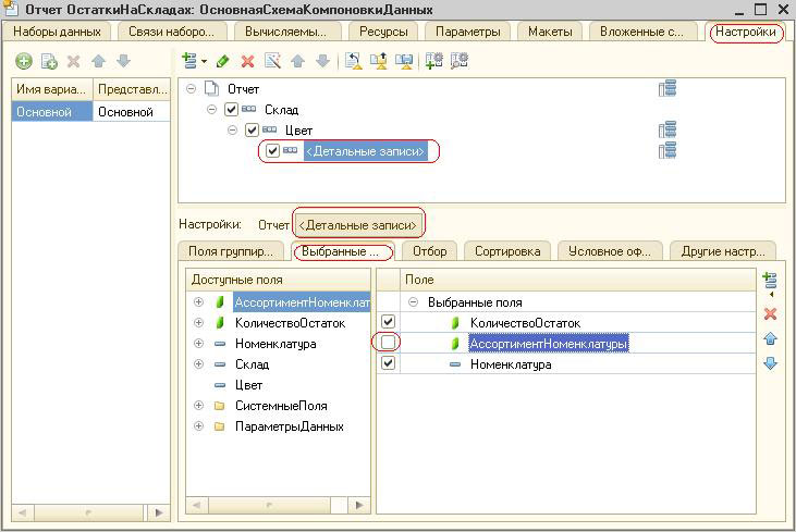 Заходим в систему компоновку данных, для этого нажмем на вкладу "Настройки" и выбираем "Детальные записи". После чего, нажимаем на них, в появившемся окне выбираем управляющею конструкцию с таким же именем. В нижней половине открываем "Выбранные поля", после чего мы увидим запись с названием "Авто". Нажимаем на запись правой кнопкой миши и выбираем "Развернуть". У нас появилось множество полей, теперь, нам потребуется найти "АссортиментНоменклатуры" и отключаем его.