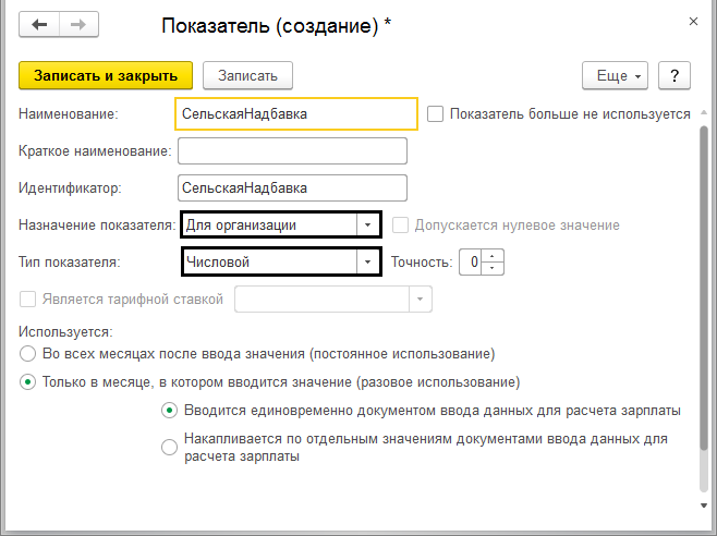 Такой показатель как «Сельская надбавка» используется сразу для всех организаций, ее тип «Числовой», например он может составлять 25% и является единым для все сотрудников.