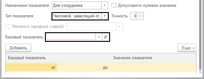 Задать тип показателя можно: «Числовой», «Денежный», «Числовой, зависящий от стажа» и «Числовой, зависящий от другого показателя».