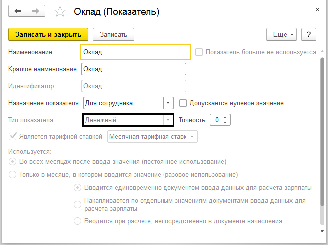 А, например «Денежный» тип показателя определенный для показателя «Оклад» задается индивидуально каждому сотруднику.