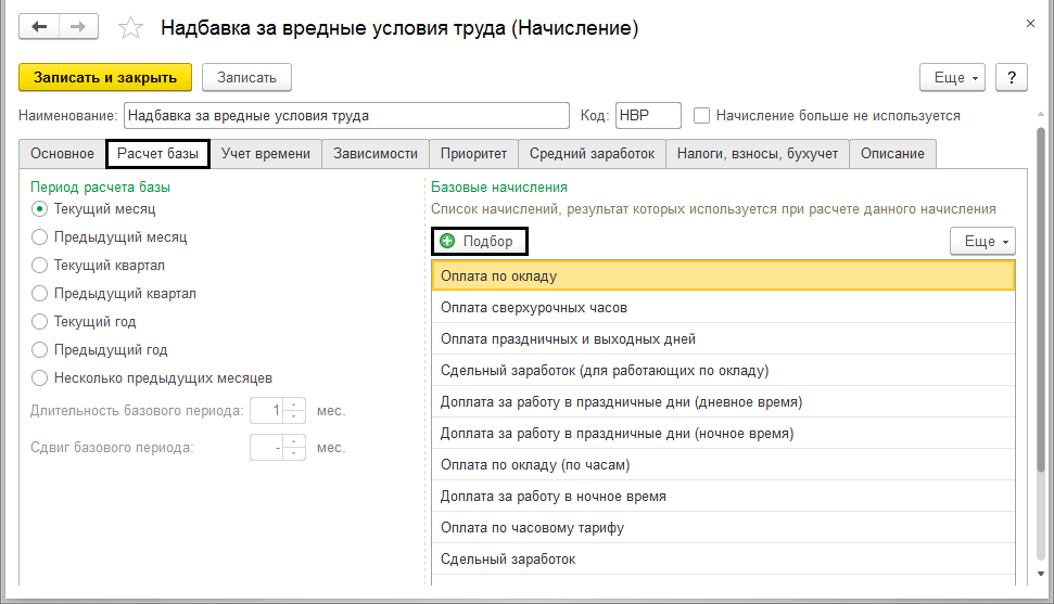 В случае использования начислениями расчетной базы, ее можно задать воспользовавшись кнопкой «Подбор» в закладке «Расчетная база». Состав сформированных начислений с выбранными расчетами можно просмотреть в списке «Базовые начисления». Также задать можно период расчета базы. Обычно базы используются за текущий месяц, однако период можно задать и другой. К примеру, рассчитанная по итогам прошлого года, квартала, месяца и т.д премия.