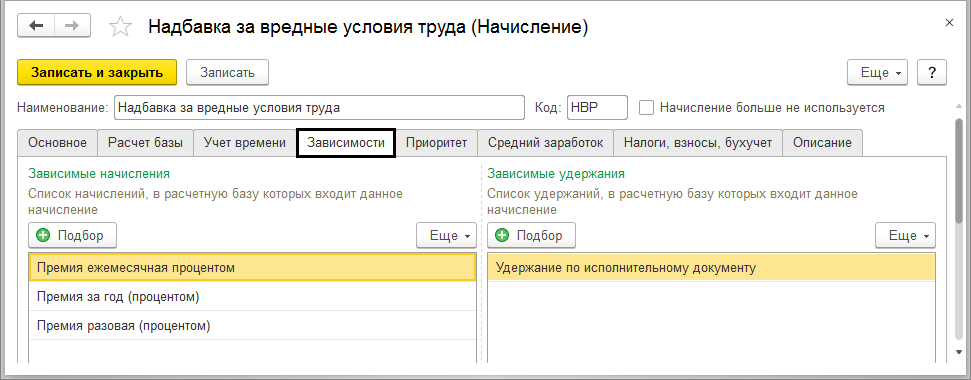 В состав каких начислений или удержаний входит данной начисление можно просмотреть в закладке «Зависимости». Если данный вид расчета находится в базе другого начисления (удержания), то он автоматически будет отображаться на той вкладке. Также добавить его можно при помощи кнопки «Подбор» в настройках базы вида расчетов.