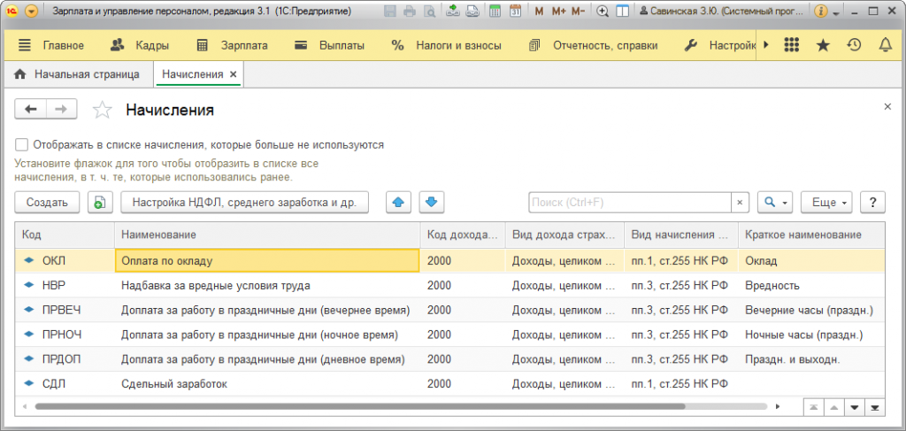 План вида расчета представляет из себя перечень элементов из начислений или удержаний, которые имеют свои реквизиты (наименование, код и т.д). Для его просмотра необходимо открыть меню «Настройка» и выбрать «Начисления» и «Удержания».
