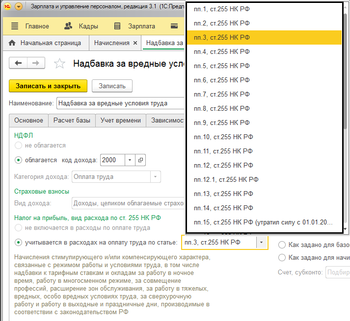 Стоит отметить, что при создании новой надбавки, которая должна быть в составе расчетной базы какого-то удержания или начисления, то это обязательно должно быть отражено в данных настройках. Достаточно часто возникает ситуация, при создании новой доплаты и не указав ее в составе базы иного начисления, программа выдает ошибку в расчете заработной платы.
