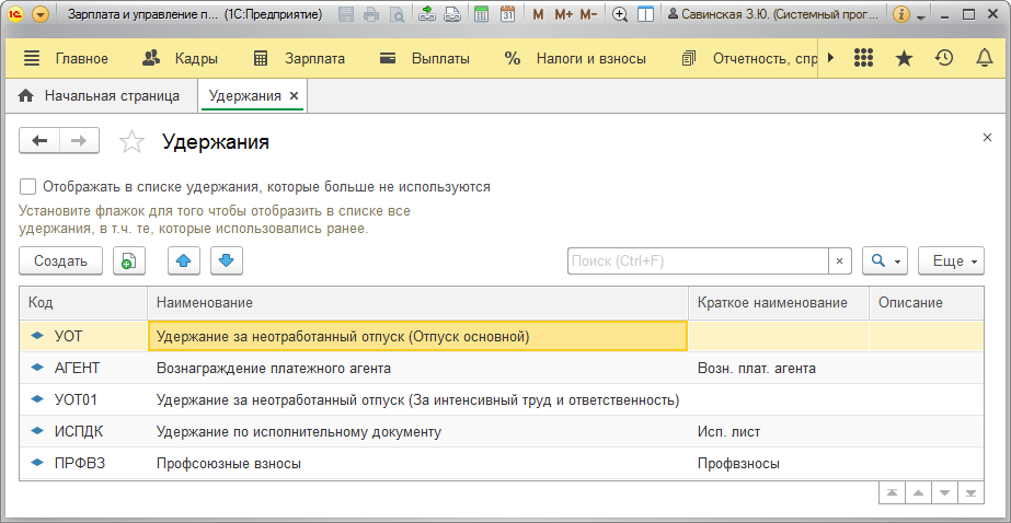 Вид нового удержания создается пользователем в закладке «Назначение удержание».