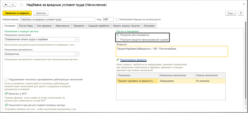 Предопределенные начисления уже предусмотрены в программе это: оплата по окладу, премии, отпуск и различные доплаты. Открыв карточку начислений, можно увидеть ее настройки. В зависимости от удобства, начисления могут быть в виде фиксированной суммы или же рассчитываться при помощи заданной формулы, которую можно отредактировать или вовсе, с учетом своего расчета, создать самостоятельно.