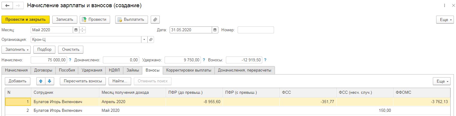 После того, как настройки программы по тарифу страхвзносов были изменены, нужно пересчитать зарплату за апрель и май (если изменения внесены в июне).
