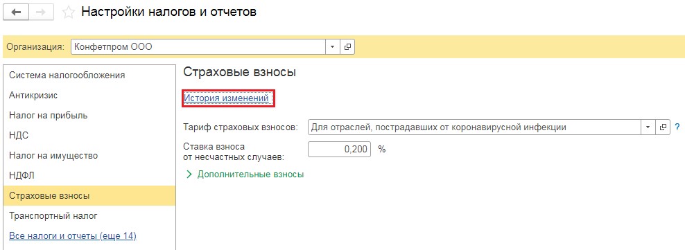 • в новом окне пройти по ссылке "История изменений вида тарифа", чтобы указать использование нового тарифа. Применить этот тариф нужно с апреля 2020 г.;