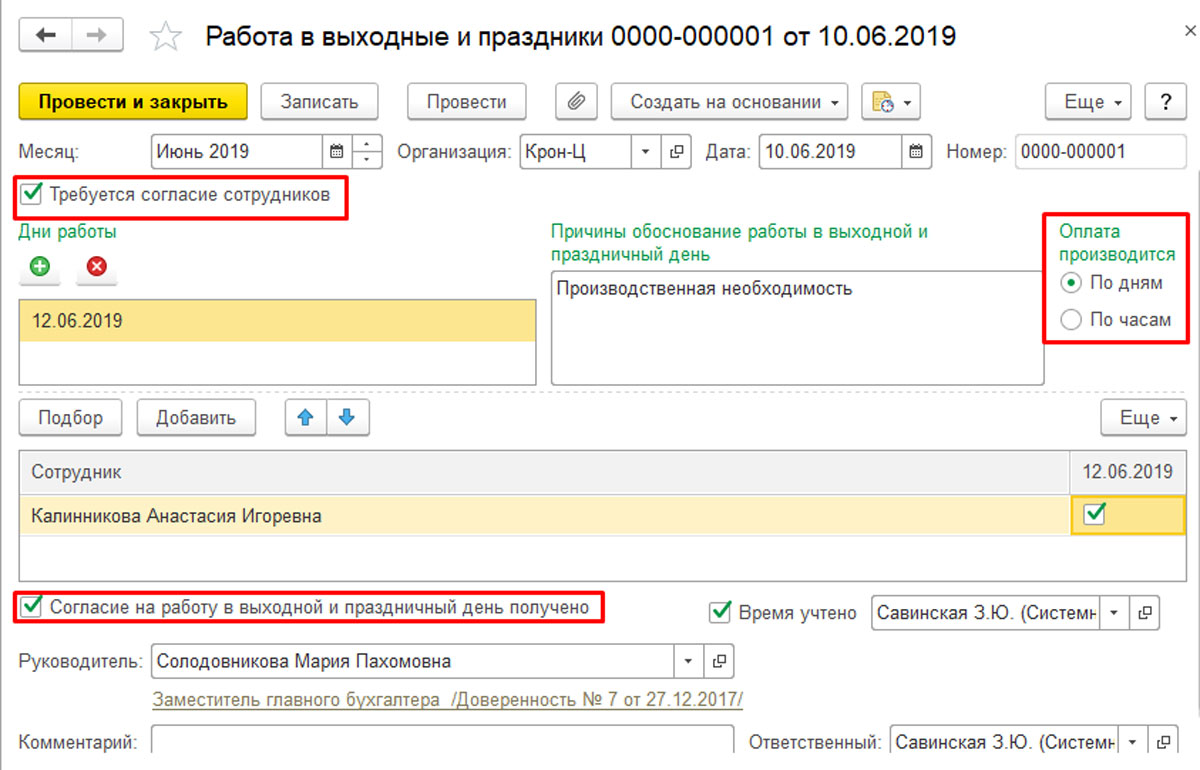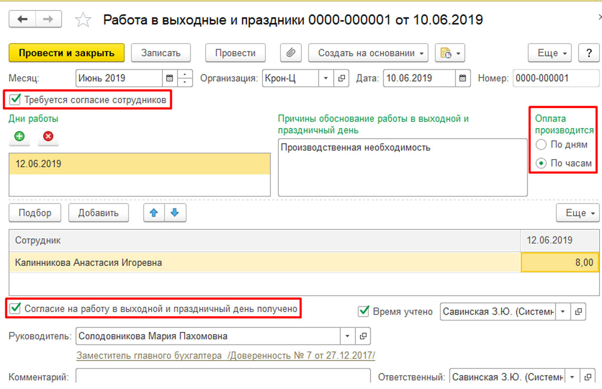 Рассмотрим ситуацию, когда работающий выходит вне своего графика в праздник или выходной с предварительным подтверждением этого письменным согласием и правильное отображение работы в выходные дни в 1С.