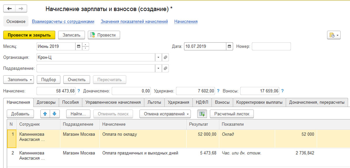 Этот документ лишь зафиксирует факт выхода в выходной или праздник, он не активирует никаких начислений в системе. Начисление проводится также через документ «Начисление зарплаты и взносов». СТС рассчитывается из показателей нормы времени производственного календаря: