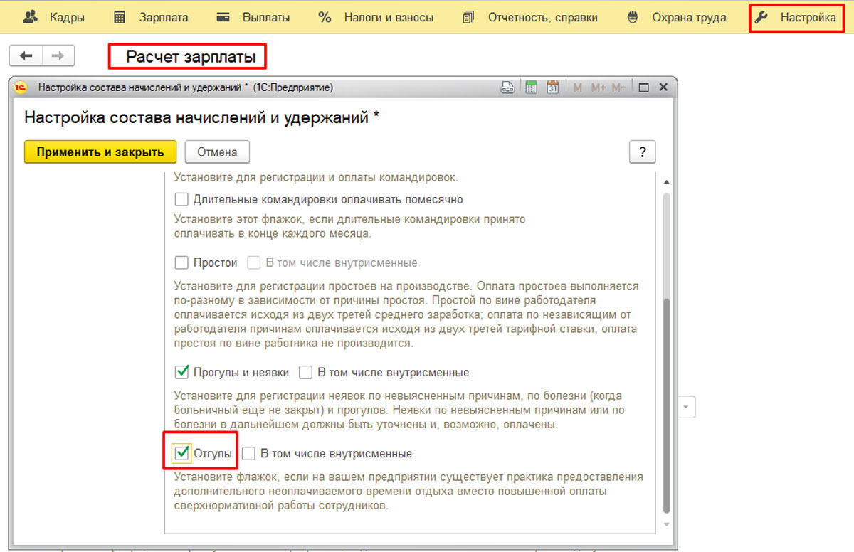 Если сравнивать с предыдущей версией ЗУП 2.5, то там не было функции для отражения подобных обстоятельств. Однако с консультацией специалиста есть возможность доработать 1С:ЗУП предыдущей версии для удобства. Активировать возможность доработки можно в разделе «Настройка» - «Расчет зарплаты» - «Учет отсутствий» - «Отгулы».