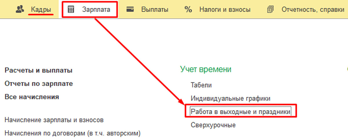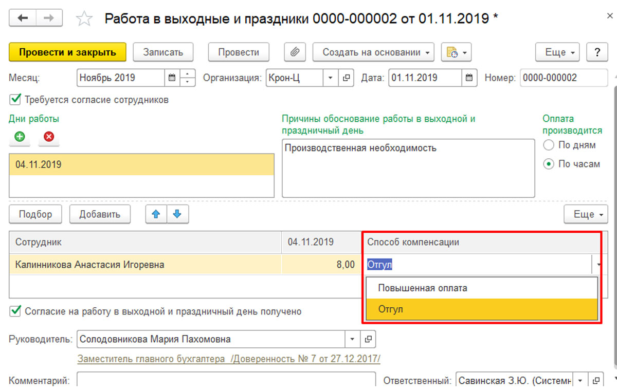Оплата выходных через документ «Работа в выходные и праздники» в 1С ЗУП ред. 3.1