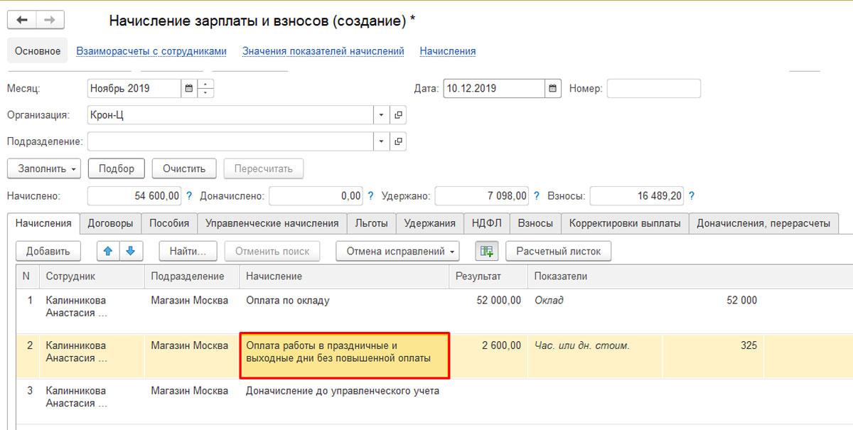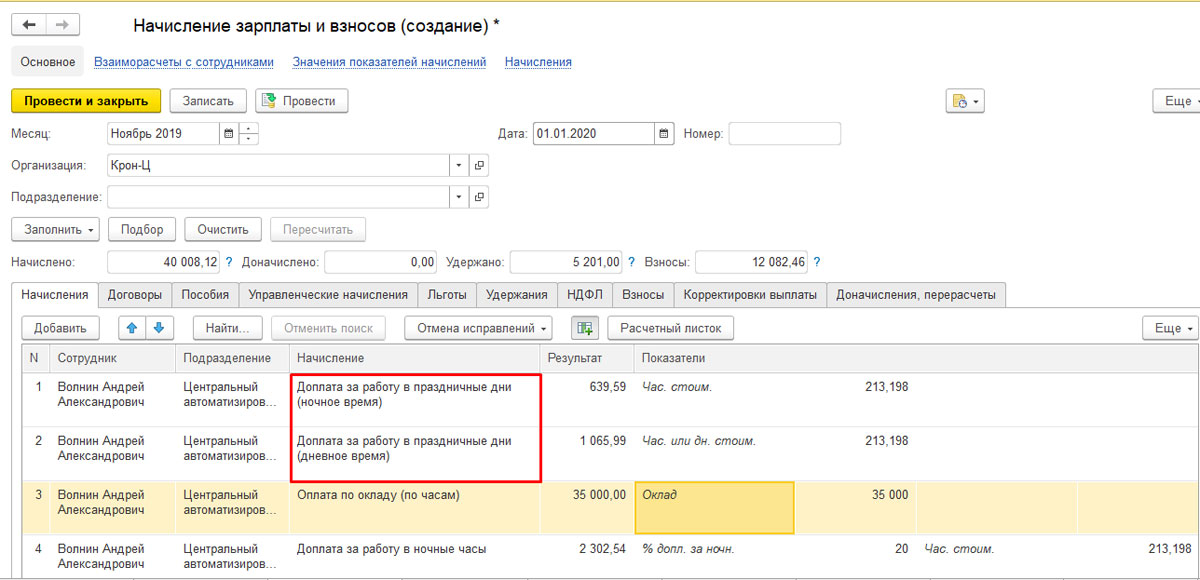 Для данной доплаты не нужно создавать никаких дополнительных документов В ЗУП 8.3, доначисления за праздничный день автоматически отобразится в «Начислении зарплаты и взносов». В созданной форме будут отображаться 2 дополнительных начисления, которые будут разбиты на 2 графы: дневное и ночное время.