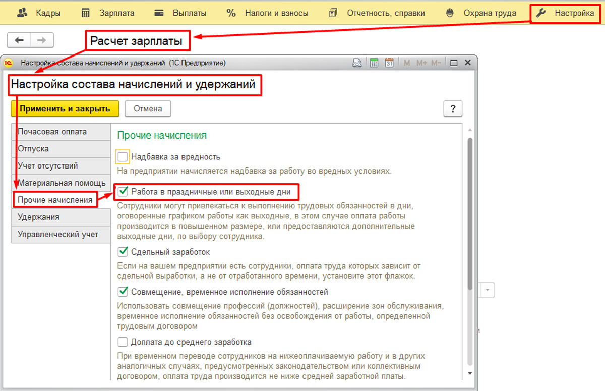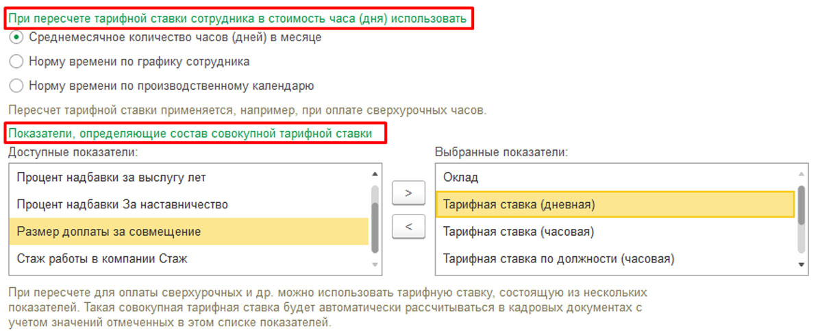 Виды начислений за праздничные дни в 1С ЗУП 8.3, которые входят в расчет совокупной тарифной ставки (СТС), подбираются в «Настройках-Расчет заработной платы», где фиксируется нужное количество часов. Рабочее время в дальнейшем будет использоваться при перерасчете оклада в часовую ставку тарифа.
