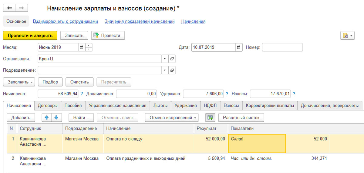 Соответствующий вид расчета в однократном объеме (без повышенной оплаты) отобразится в документе начисления.