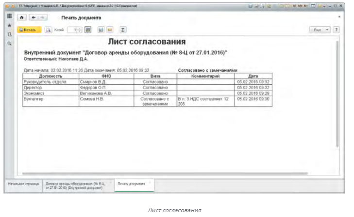 Например, смешанное согласование позволяет реализовать регламент обработки договора, по которому договор могут параллельно согласовывать главный бухгалтер и юрист, после них — заместитель генерального директора и, если замечаний нет, генеральный директор. По результатам согласования можно распечатать Лист согласования: