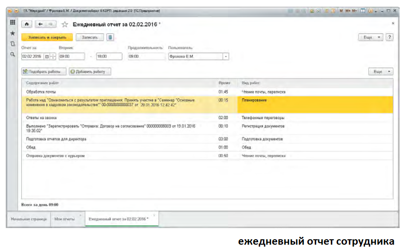 Записи в ежедневный отчет вносятся как вручную, так и автоматически при включении хронометража (например, по документу или по задаче).