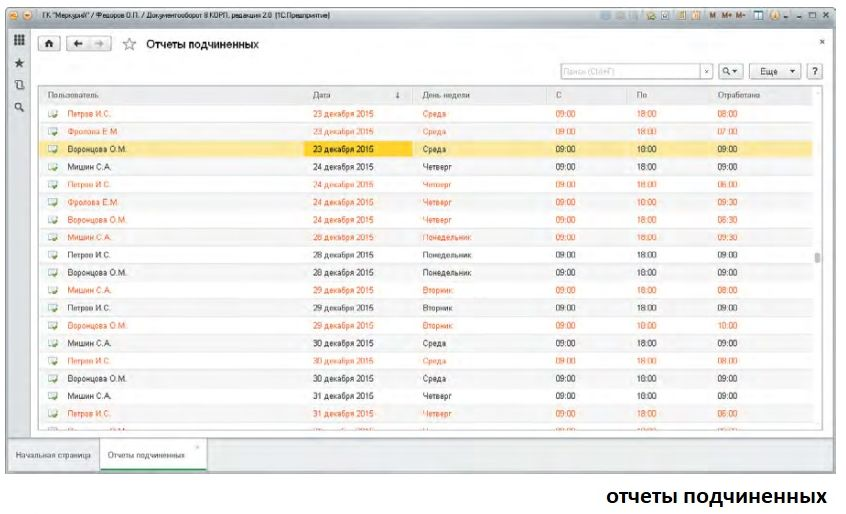 Красным цветом отображаются отчеты, в которых суммарное время работы не совпадает со временем начала и окончания рабочего дня: