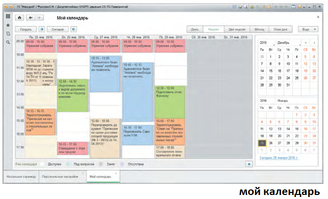 Календарь. Окно «мой календарь» - это персональный инструмент планирования. Он внешне схож с календарями почтовых сервисов (типа Outlook), и прост в работе с ним:
